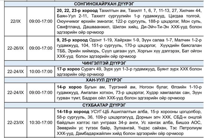 “Улаанбаатар цахилгаан түгээх станц” ТӨХК цахилгаан шугам тоноглолд засвар, үйлчилгээ хийнэ. Энэ үеэр дөрвөн дүүргийн зарим хороонд цахилгааныг тодорхой цагаар хязгаарлана. Хуваарийн дагуу өнөөдөр цахилгаан түр хязгаарлах газруудыг танилцуулж байна. Цахилгааны хязгаарлалт 10:00-17:00 цагийн хооронд үргэлжилнэ.