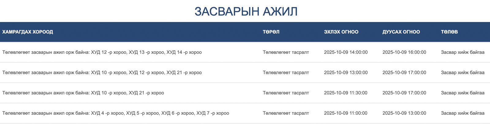 Нийслэлийн Хан-Уул дүүргийн есөн хорооны нутаг дэвсгэрт байрлах цахилгаан эрчим хүчний шугам сүлжээнд өнөөдөр /2025.10.09/ төлөвлөгөөт засвар хийх хуваарийг танилцуулж байна.