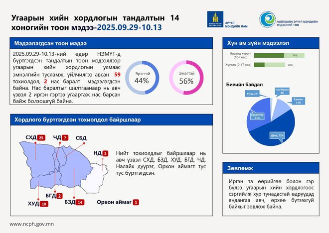 Угаарын хийн хордлогын тандалтын 14 хоногийн тоон мэдээллийг Нийгмийн эрүүл мэндийн үндэсний төвөөс танилцууллаа.