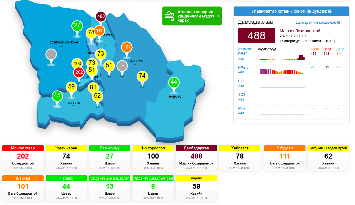 Агаарын чанарын индексийн хэмжилтийг заадаг agaar.mn сайтад мэдээлж буйгаар өнөөдөр 19 цагийн байдлаар Дамбадаржаа орчмоор агаар маш их бохирдолтой байна.