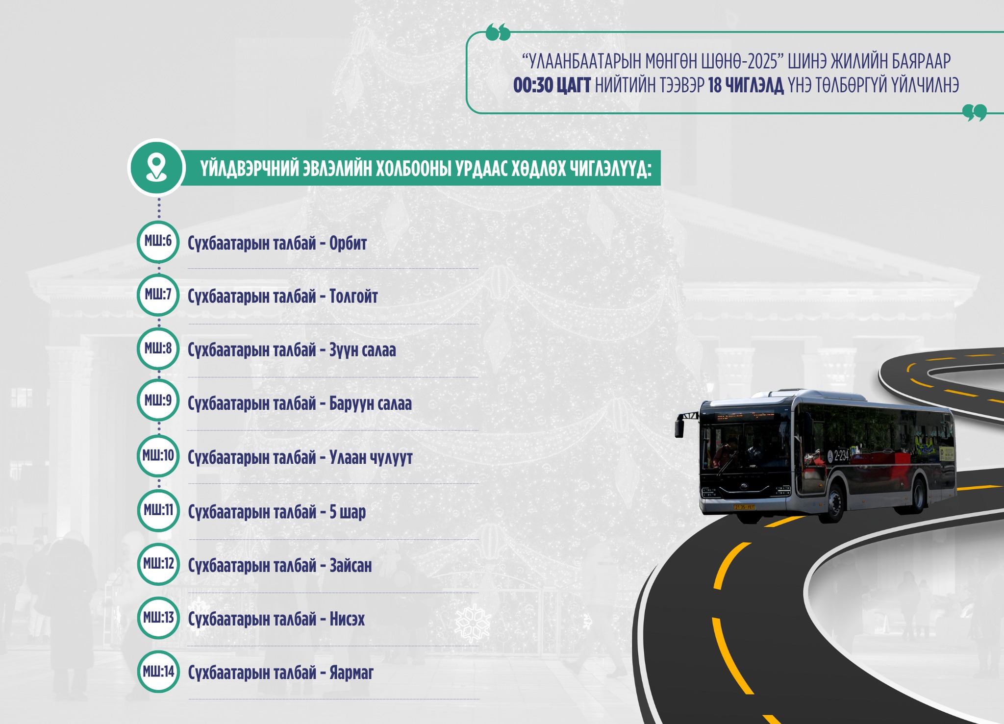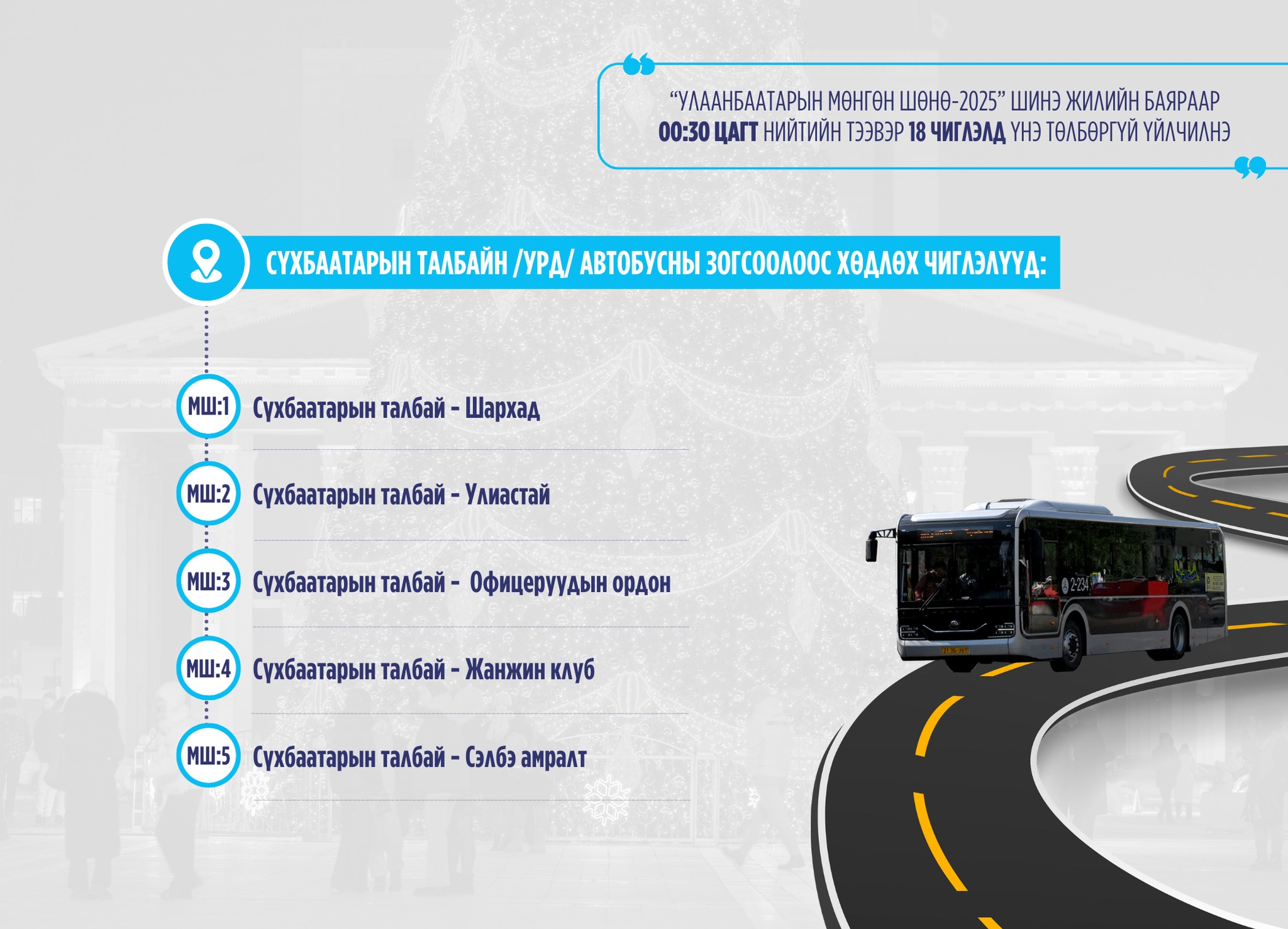 2025 оны 12 дугаар сарын 31-ний өдөр төв талбайд “Улаанбаатарын мөнгөн шөнө-2025” шоу тоглолт болно.