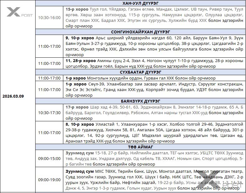 УБЦТС ТӨХК-аас цахилгаан шугам тоноглолд засвар хийх өнөөдөр (2026.03.09) байршил, цагийн хуваарийг мэдээллээ.