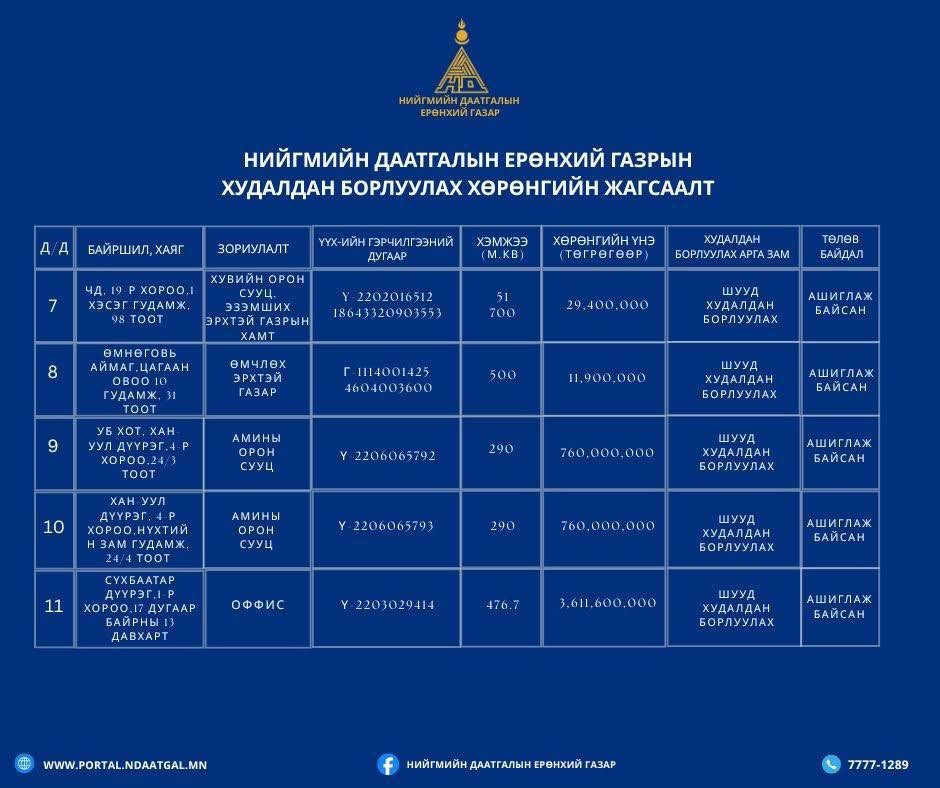 Худалдан борлуулагдаагүй үлдсэн 37 ширхэг хөрөнгөнөөс шууд худалдан борлуулах боломжтой 11 үл хөдлөх хөрөнгийн мэдээллийг нээлттэй мэдээлж байна.
