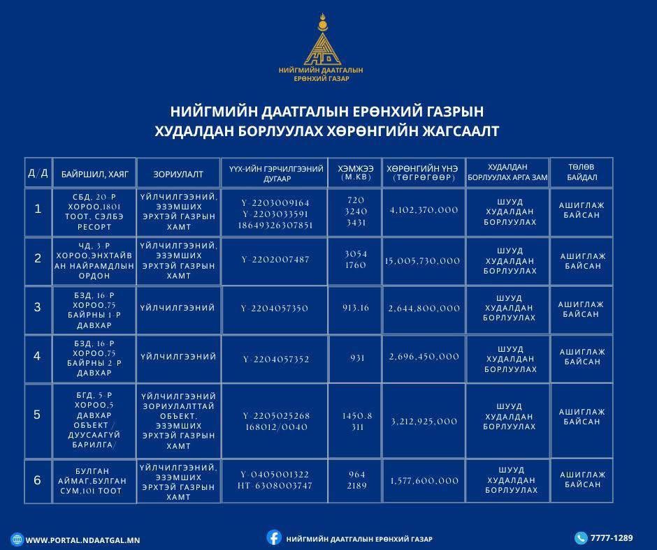 Цаашид тус газраас бусад үл хөдлөх хөрөнгийг худалдан борлуулахаар нээлттэй дуудлагын худалдааг зохион байгуулах бөгөөд зарыг нийгмийн даатгалын байгууллагын цахим хуудас, фэйсбүүк хуудсаар олон нийтэд хүргэх юм байна.