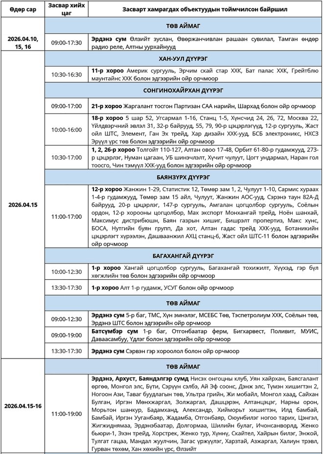 Улаанбаатар цахилгаан түгээх сүлжээ ТӨХК-аас өнөөдөр цахилгааны шугам сүлжээнд хийх засварын хуваарийг танилцууллаа.